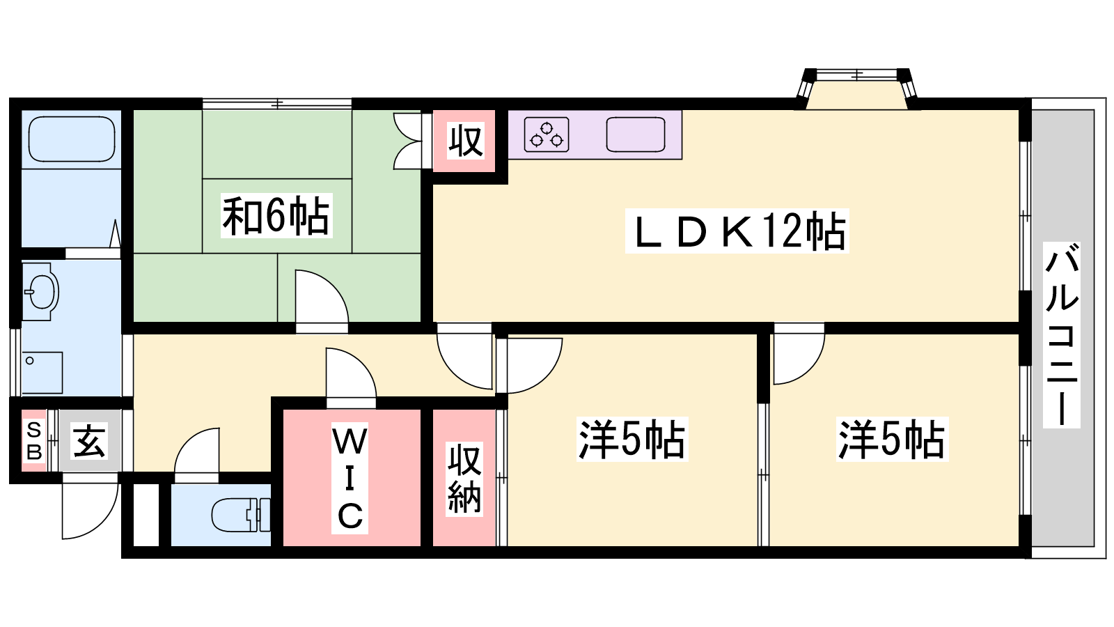 - LDK12帖、和室6帖、洋室5帖、洋室5帖