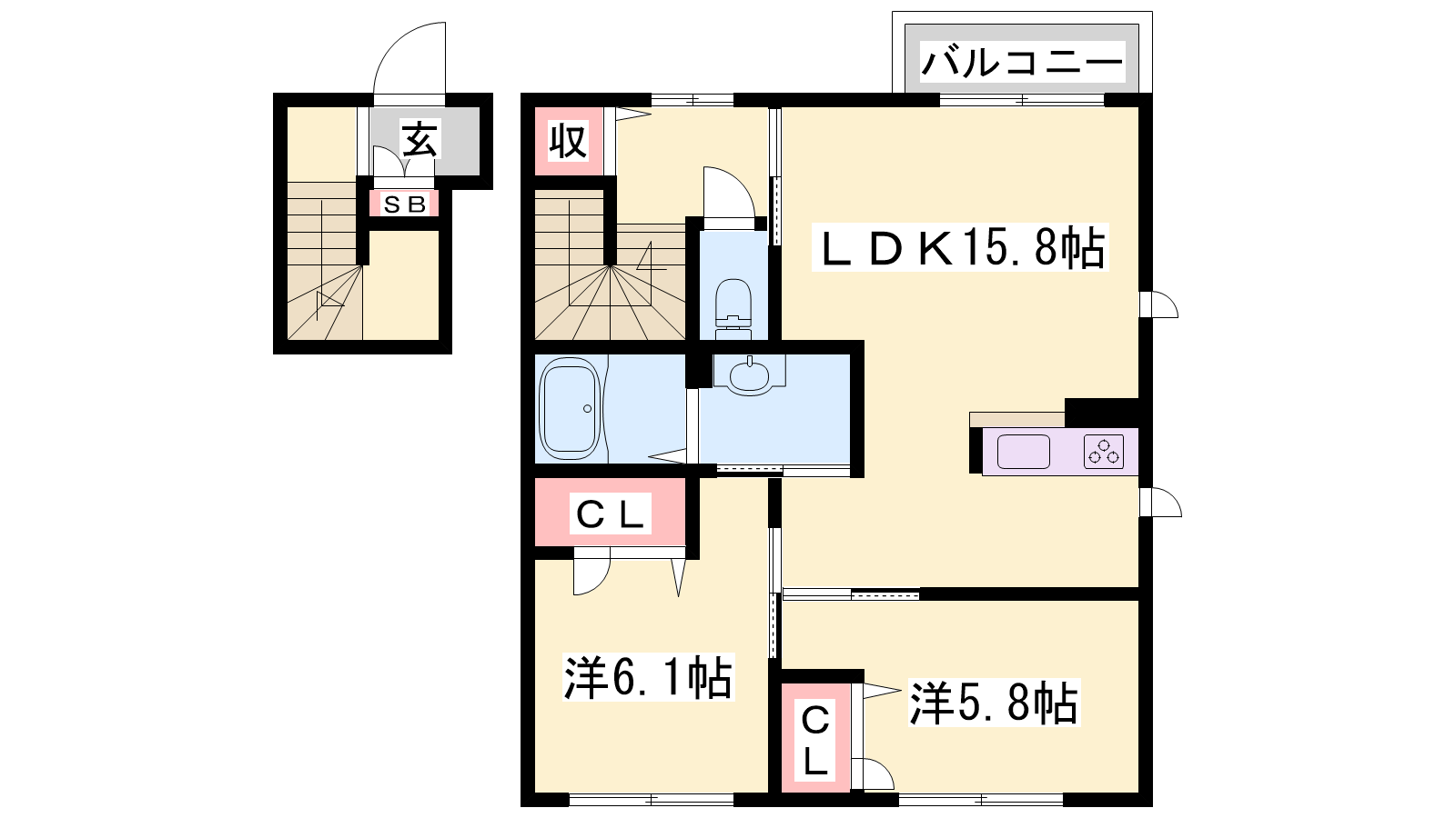 - LDK15.8帖、洋室6.1帖、洋室5.8帖