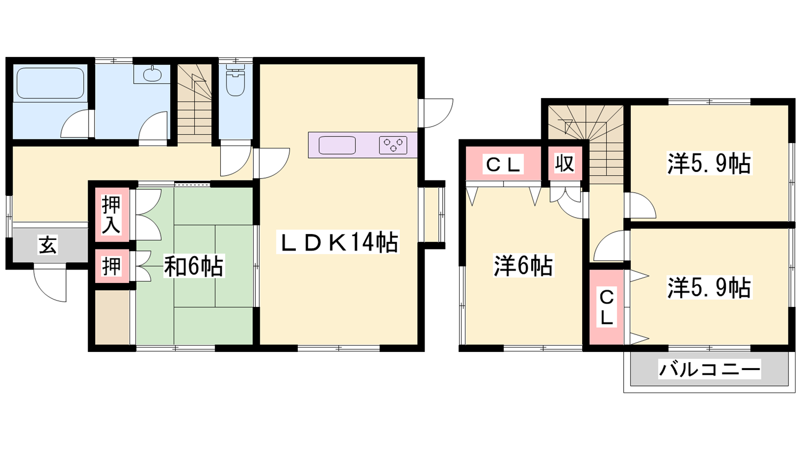 - LDK14帖、洋室6帖、和室6帖、洋室5.9帖、洋室5.9帖