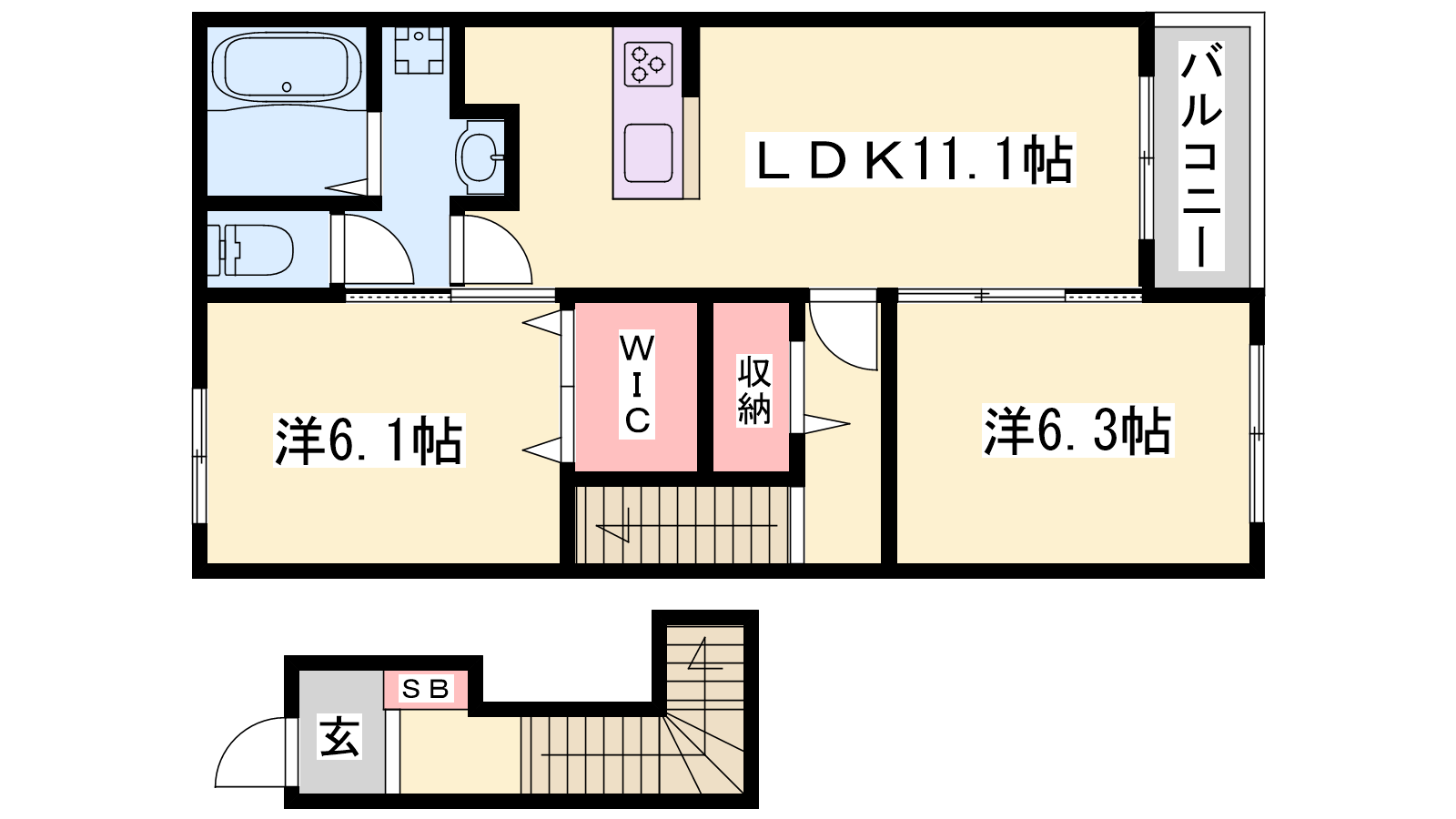 - LDK11.1帖、洋室6.3帖、洋室6.1帖