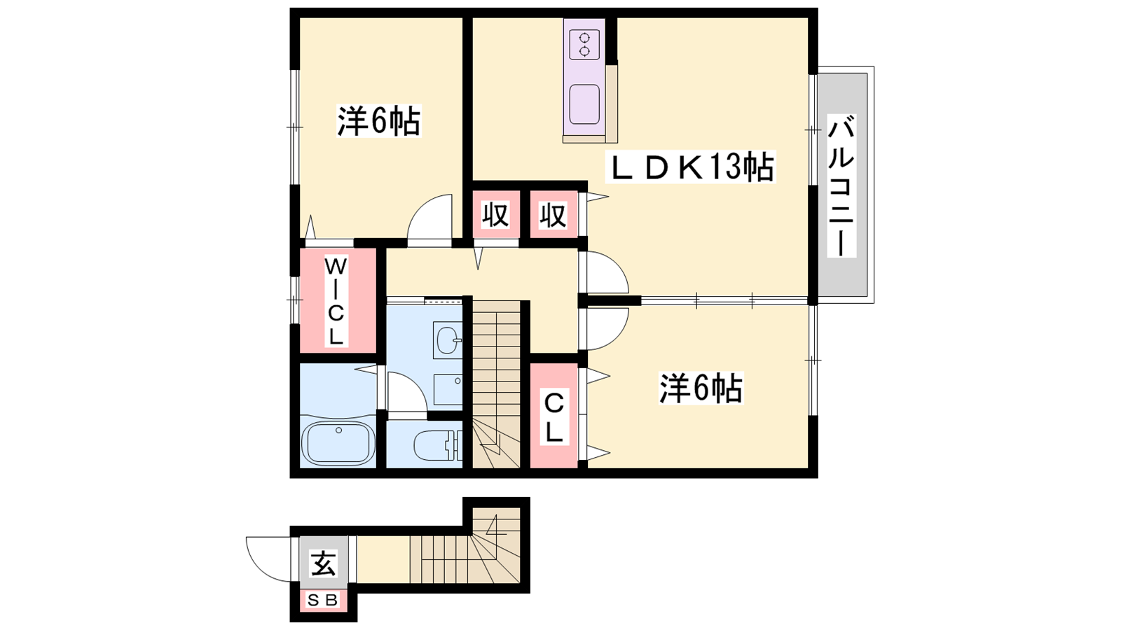 - LDK13帖、洋室6帖、洋室6帖
