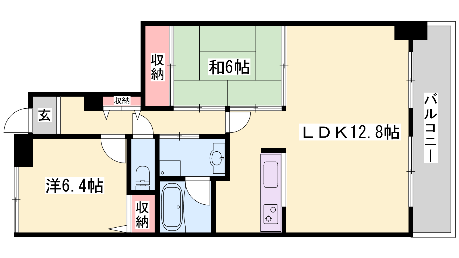 - LDK12.8帖、洋室6.4帖、和室6帖