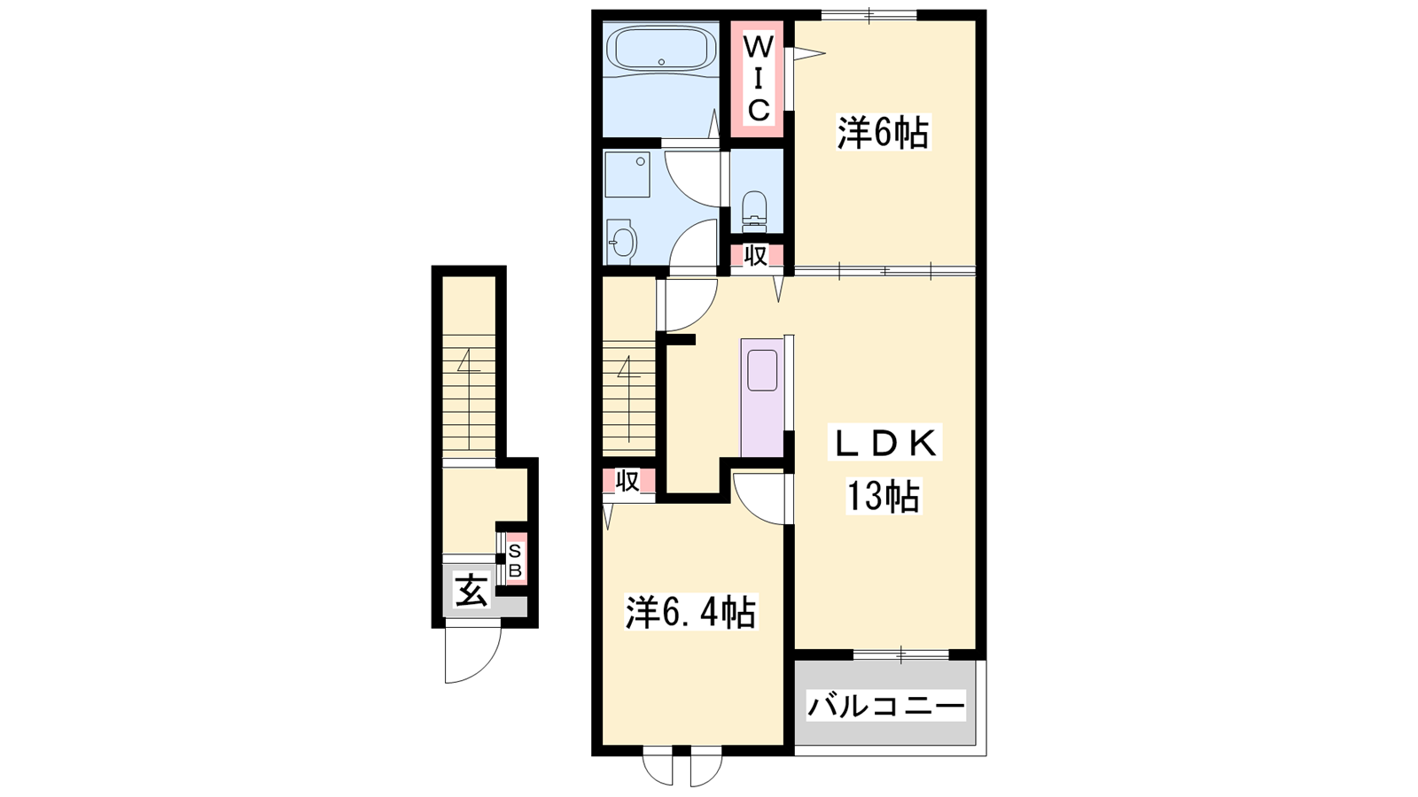 - LDK13帖、洋室6帖、洋室6.4帖