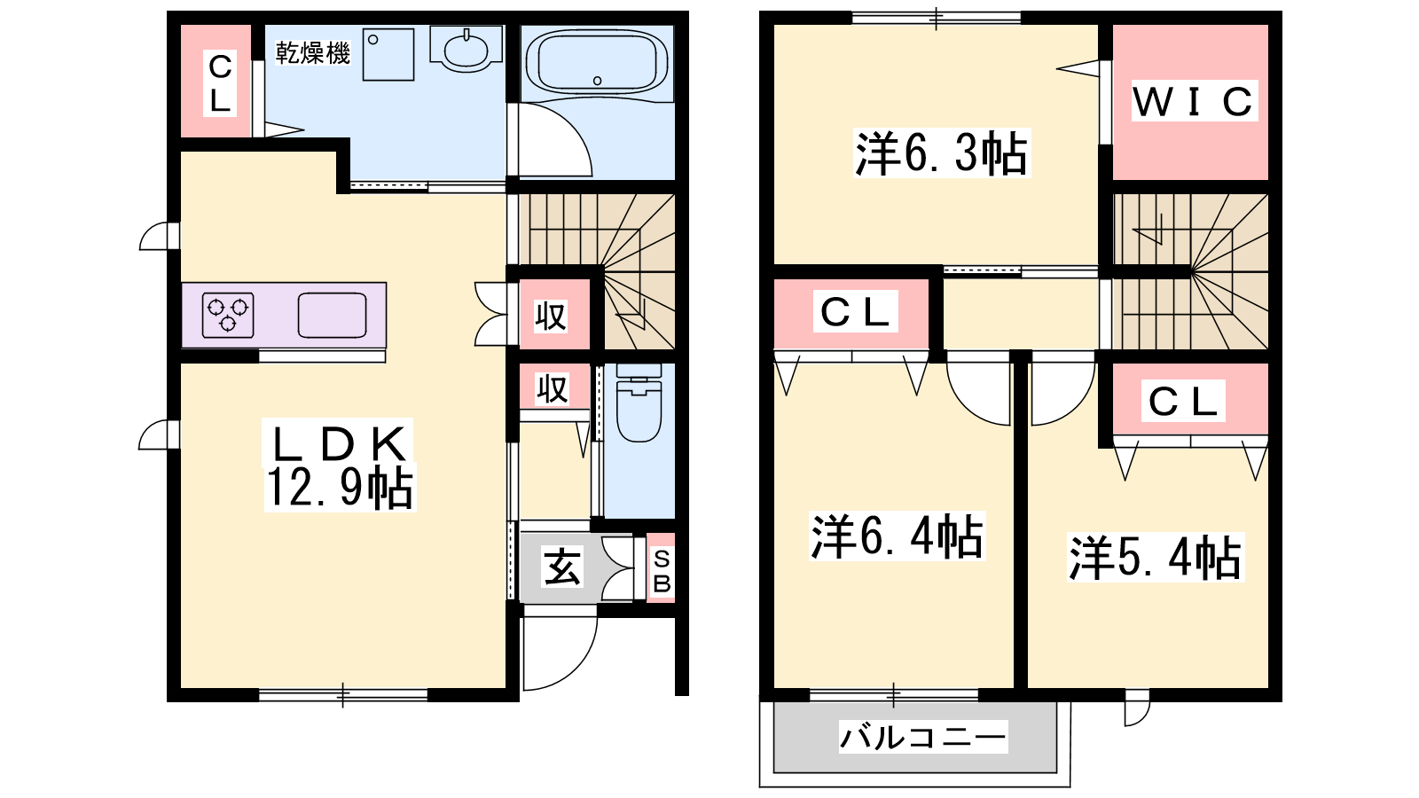 - LDK12.9帖、洋室6.4帖、洋室6.3帖、洋室5.4帖