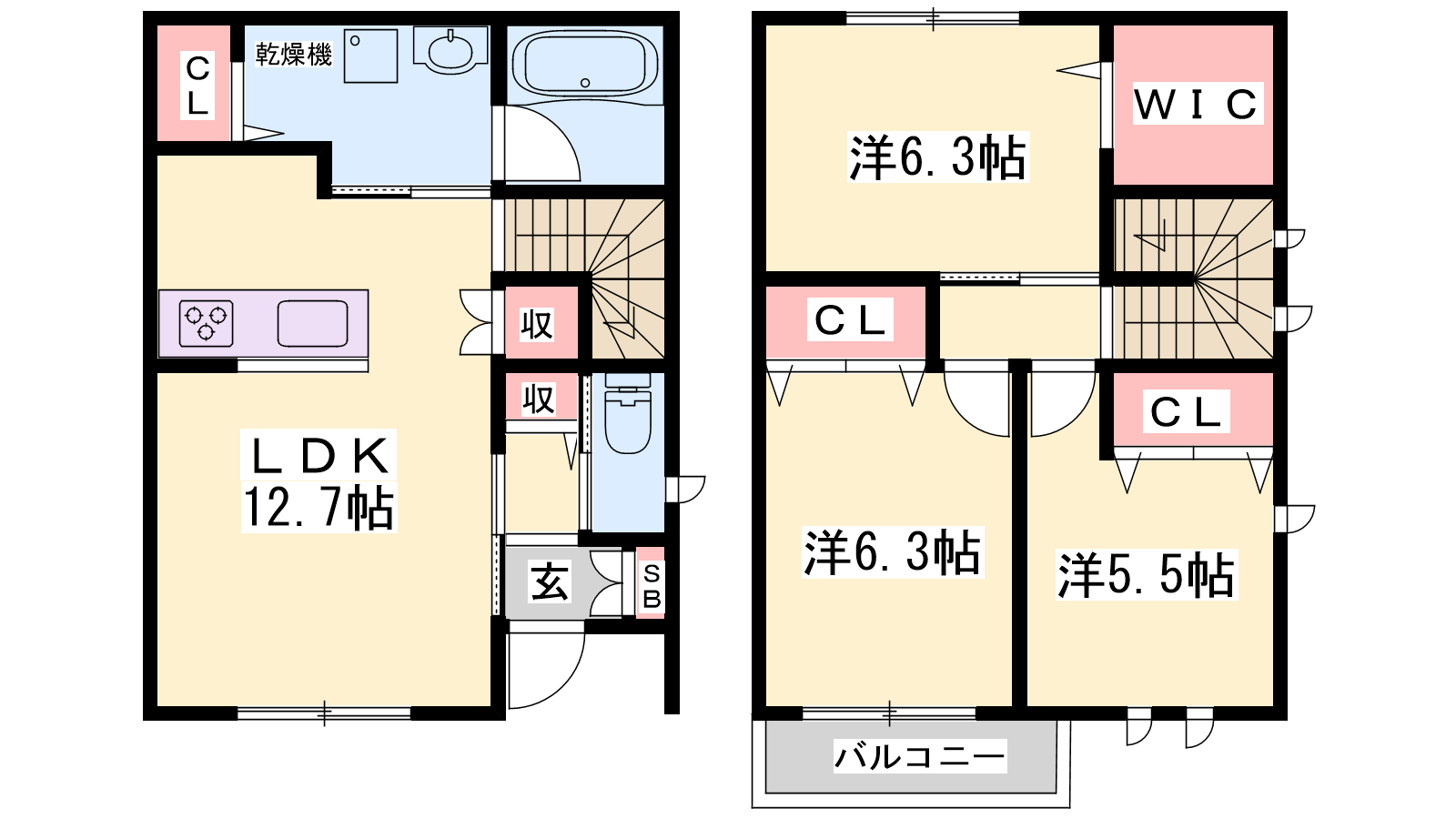 - LDK12.7帖、洋室6.3帖、洋室6.3帖、洋室5.5帖