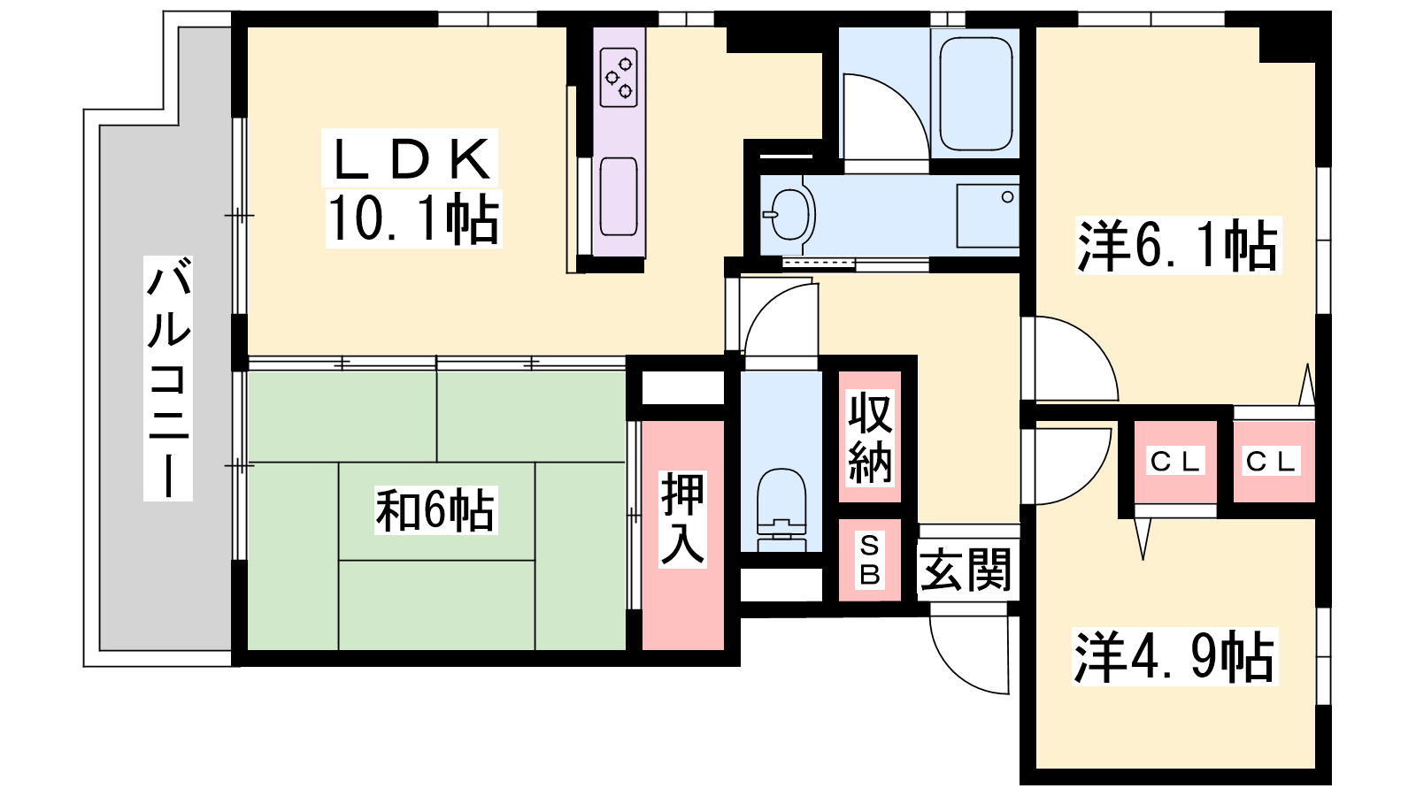 - LDK10.1帖、洋室6.1帖、洋室4.9帖、和室6帖