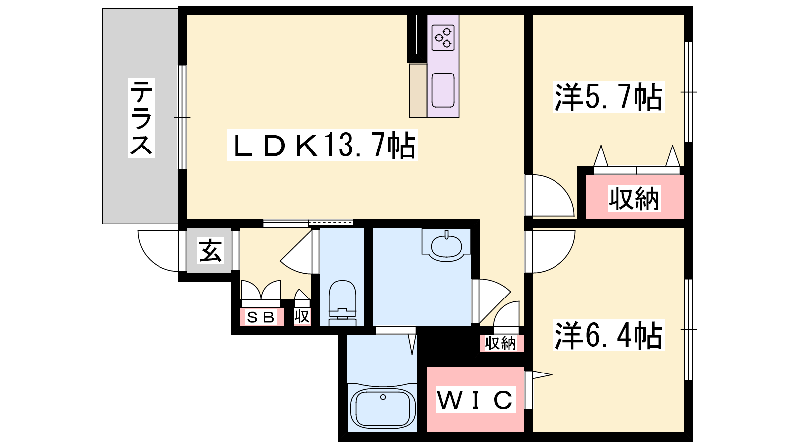 - LDK13.7帖、洋室5.7帖、洋室6.4帖