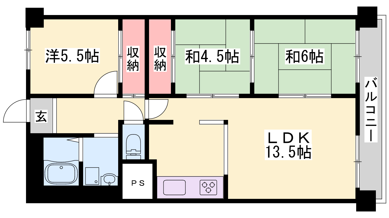 - LDK13.5帖、洋室5.5帖、和室6帖、和室4.5帖