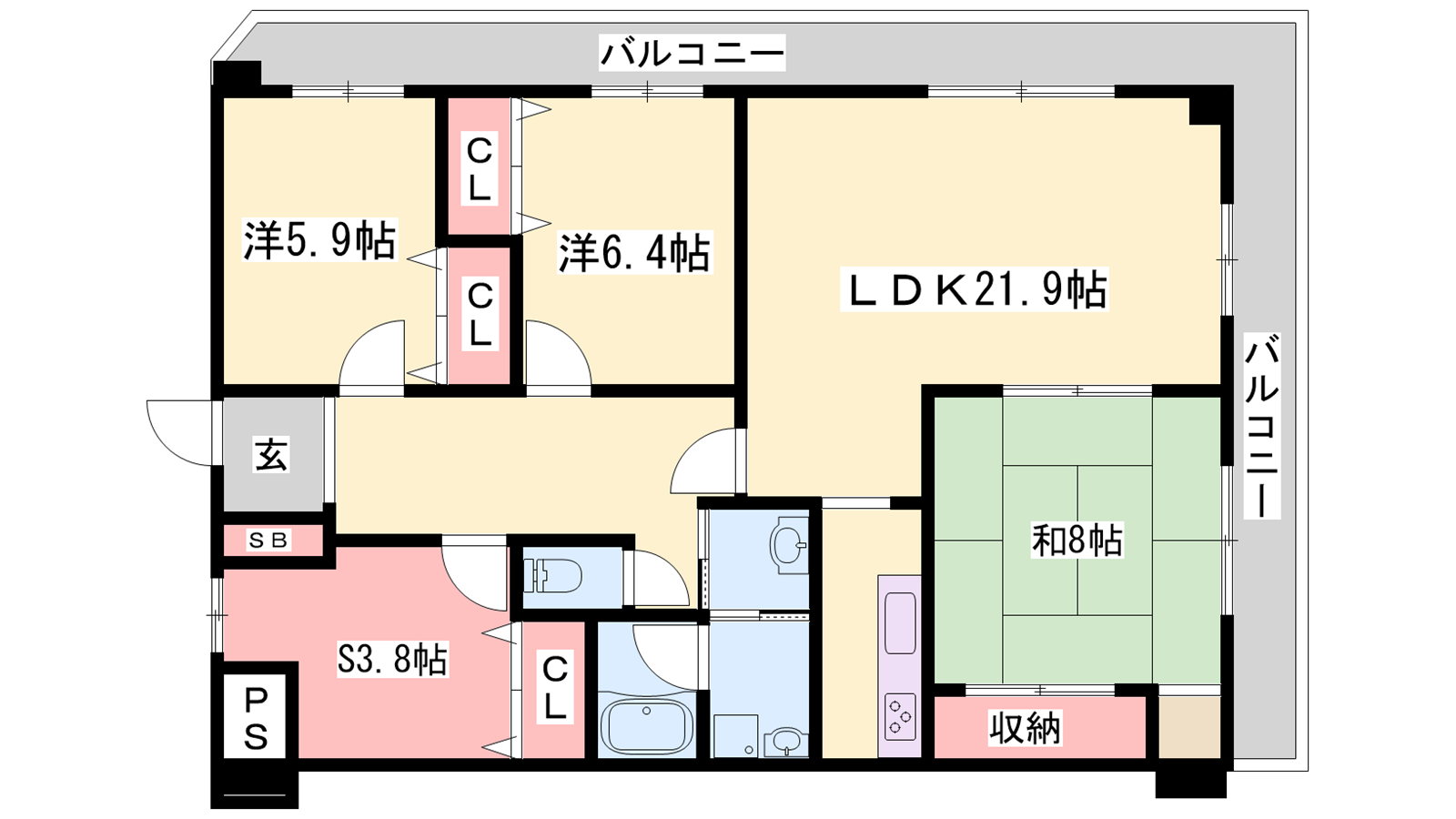 - LDK21.9帖、洋室6.4帖、和室5.9帖、和室8帖、S3.8帖
