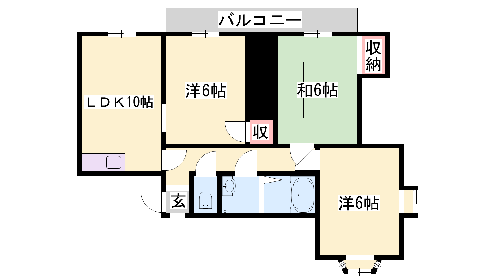 - LDK10帖、洋室6帖、洋室6帖、和室6帖