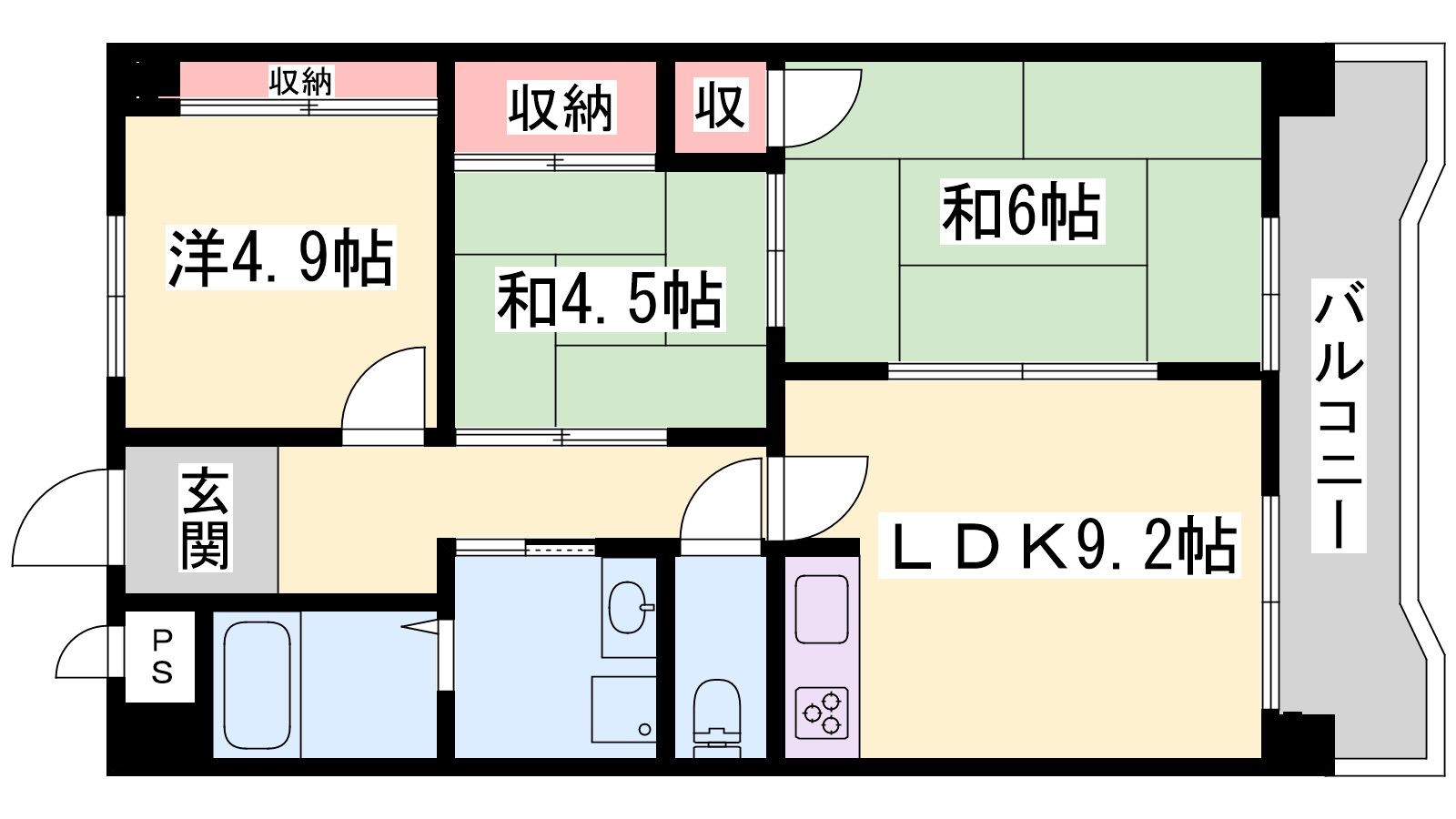 - LDK9.2帖、洋室4.9帖、和室4.5帖、和室6帖