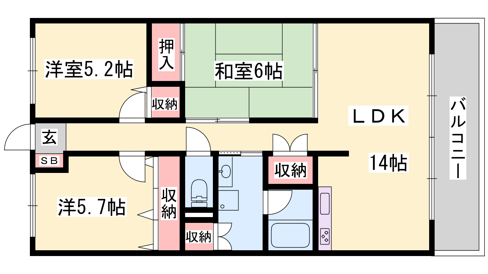 - LDK14帖、洋室5.2帖、洋室5.7帖、和室6帖