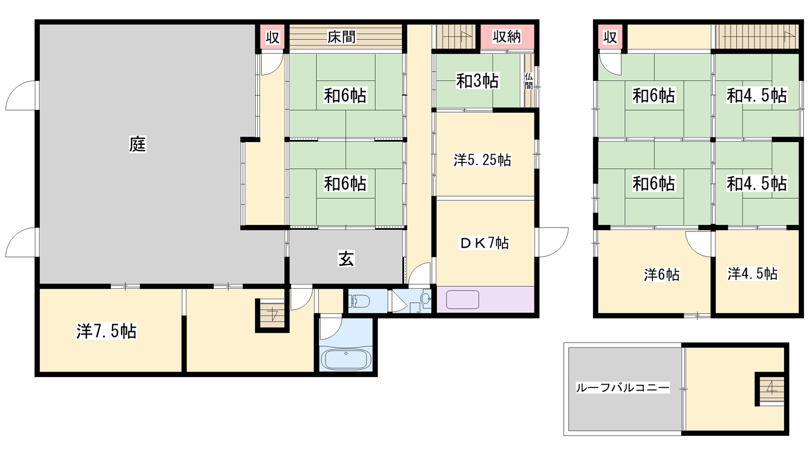 - DK7帖、洋室4.5帖、洋室5.25帖、洋室6帖、洋室7.5帖、和室3帖、和室4.5帖、和室4.5帖、和室6帖、和室6帖