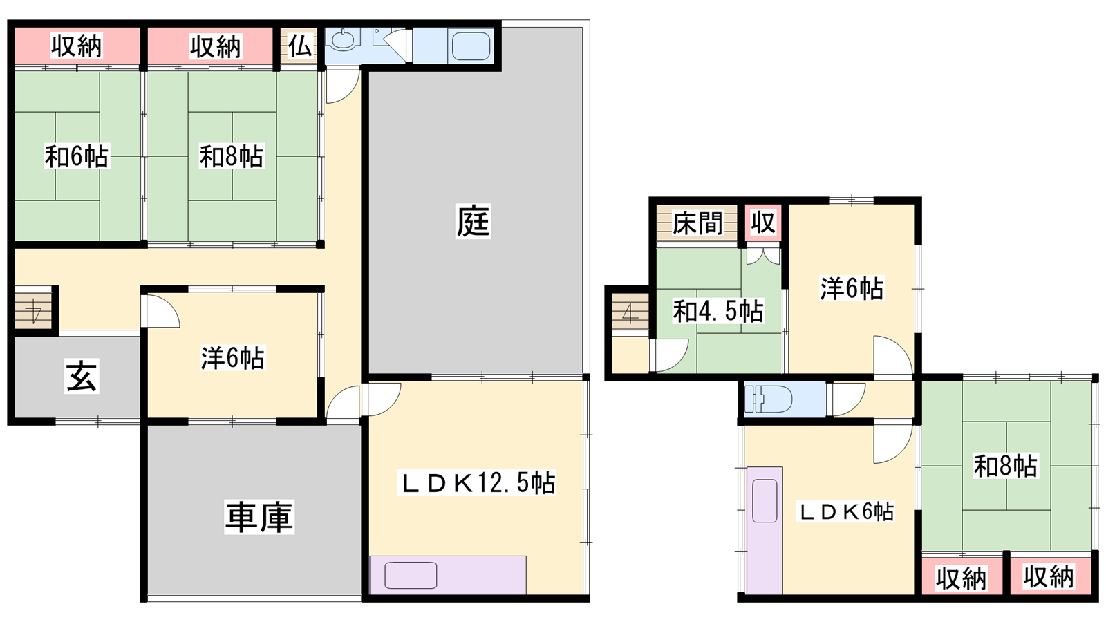 - LDK8帖、LDK12.5帖、洋室6帖、洋室6帖、和室4.5帖、和室6帖、和室8帖、和室8帖