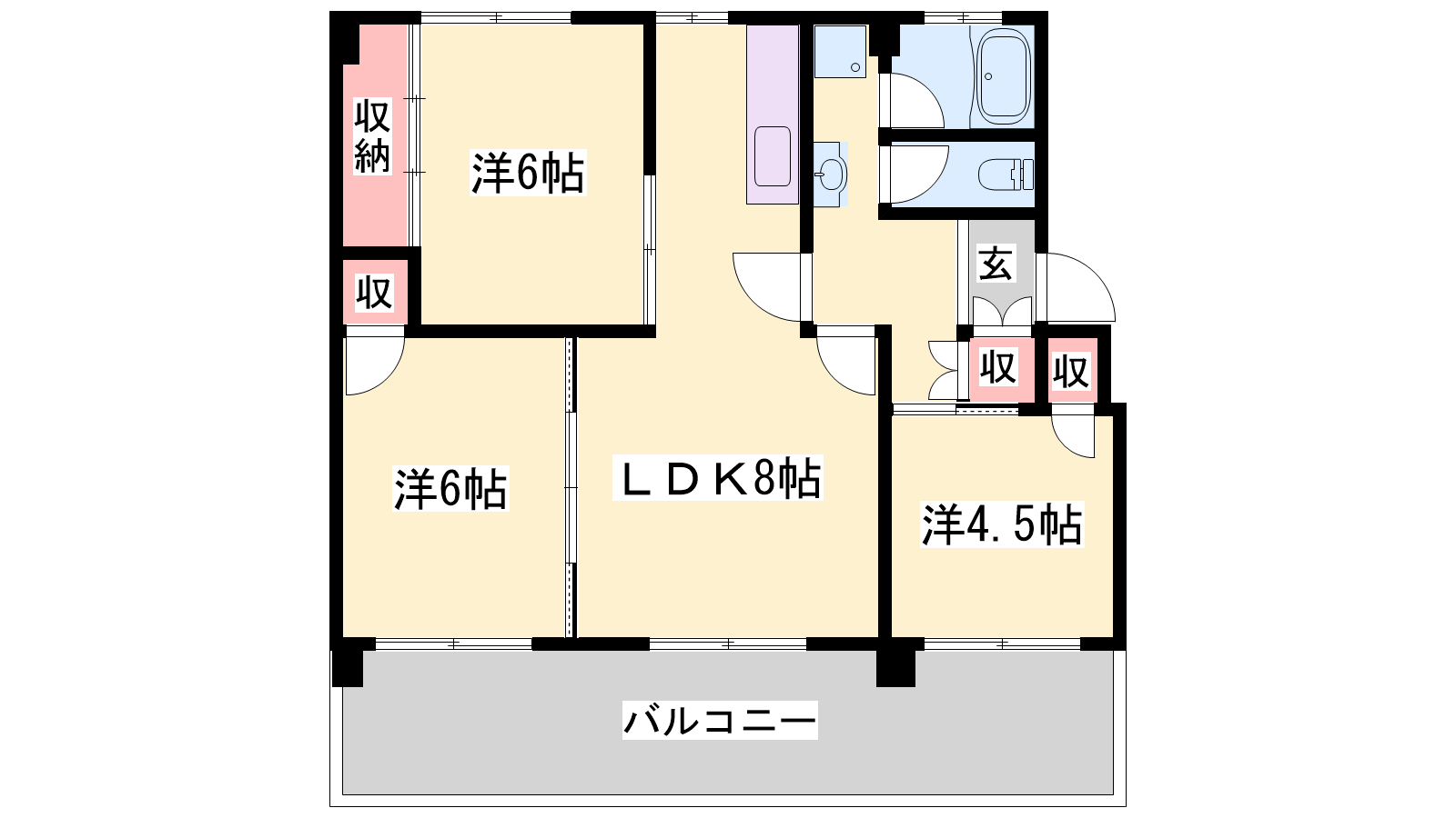 - LDK8帖、洋室6帖、洋室6帖、洋室4.5帖