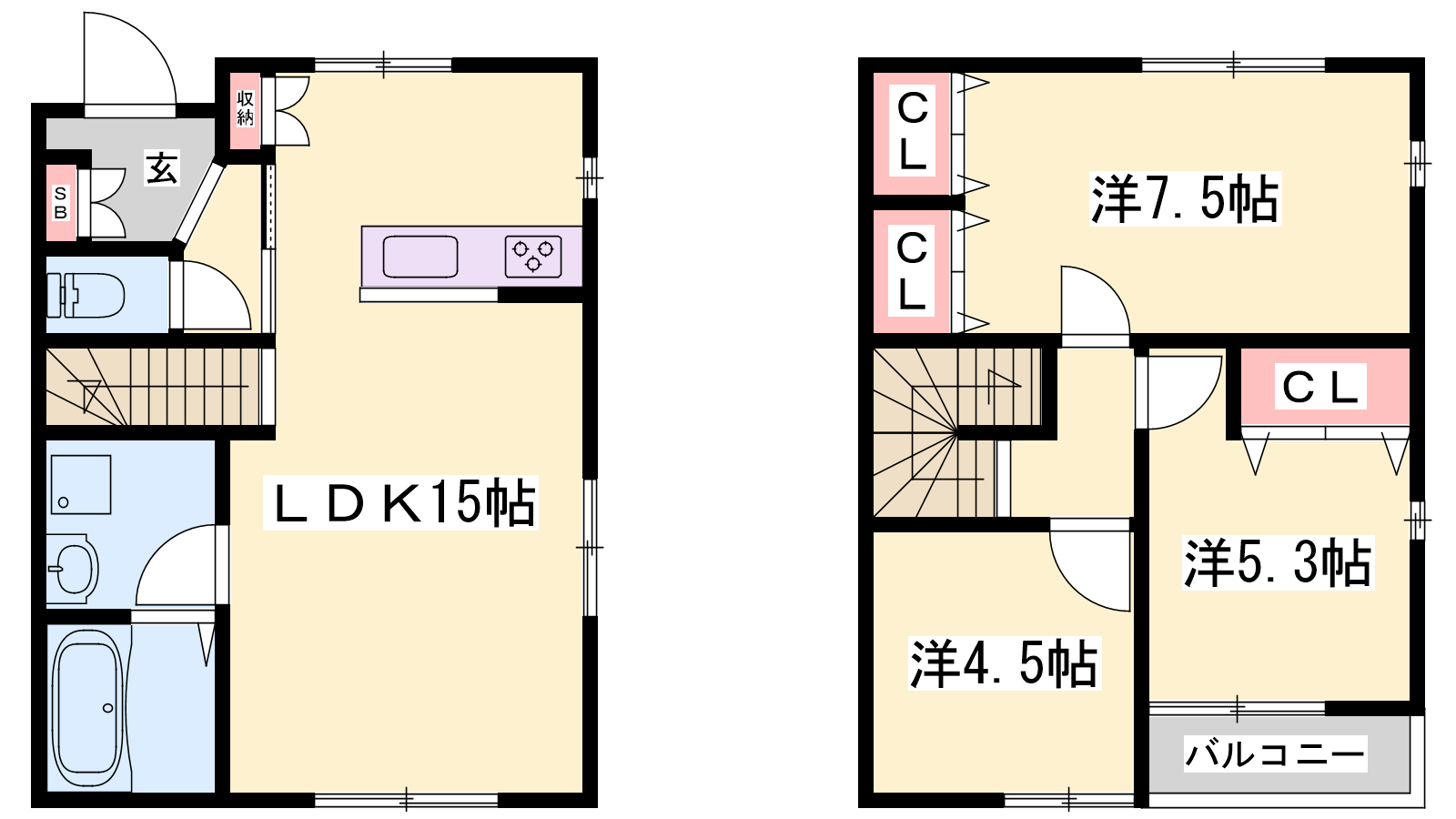 - LDK15帖、洋室7.5帖、洋室5.3帖、洋室4.5帖