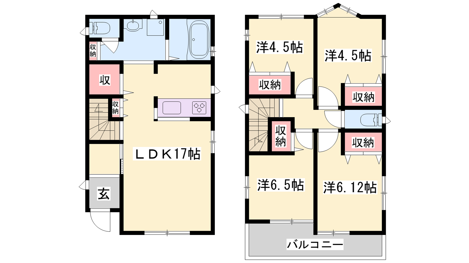 - LDK17帖、洋室4.5帖、洋室4.5帖、洋室6.5帖、洋室6.12帖
