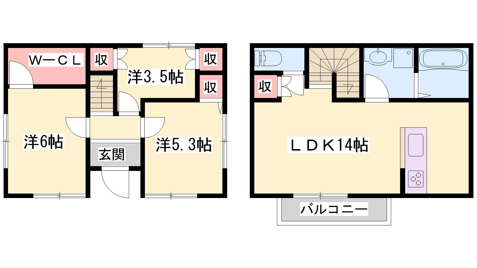 - LDK14帖、洋室6帖、洋室5.3帖、洋室3.5帖