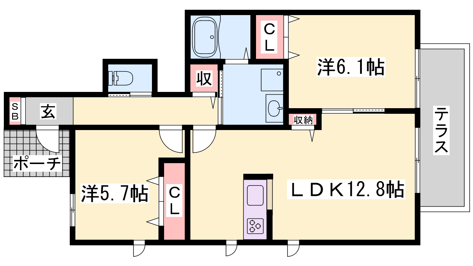 - LDK12.8帖、洋室6.1帖、洋室5.7帖