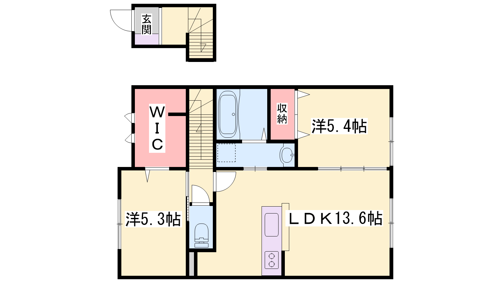 - LDK13.6帖、洋室5.4帖、洋室5.3帖