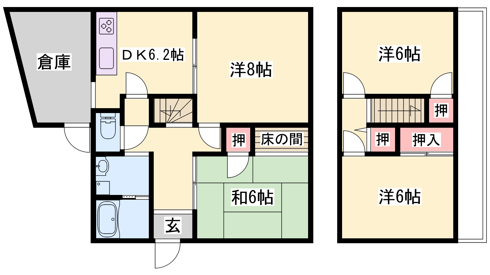 - DK6.2帖、洋室8帖、洋室6帖、洋室6帖、和室6帖
