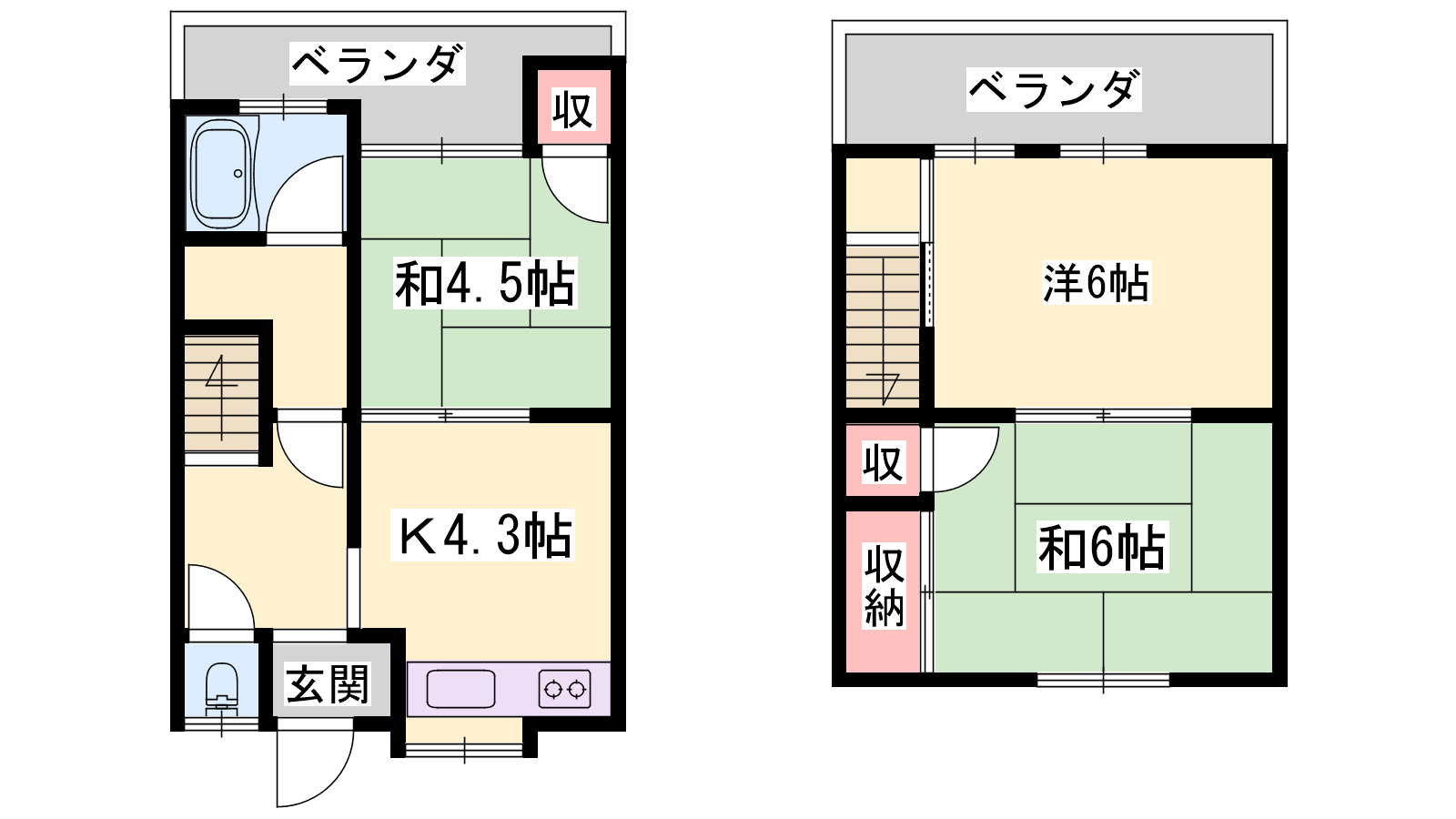 - K4.3帖、洋室6帖、和室6帖、和室4.5帖
