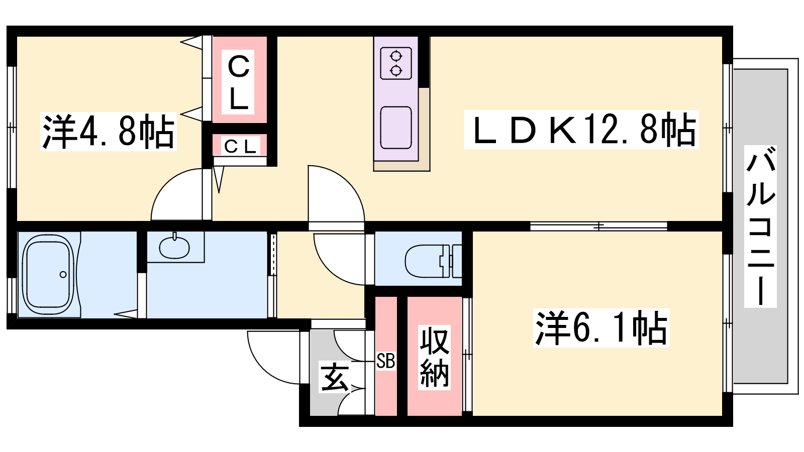 - LDK12.8帖、洋室4.8帖、洋室6.1帖
