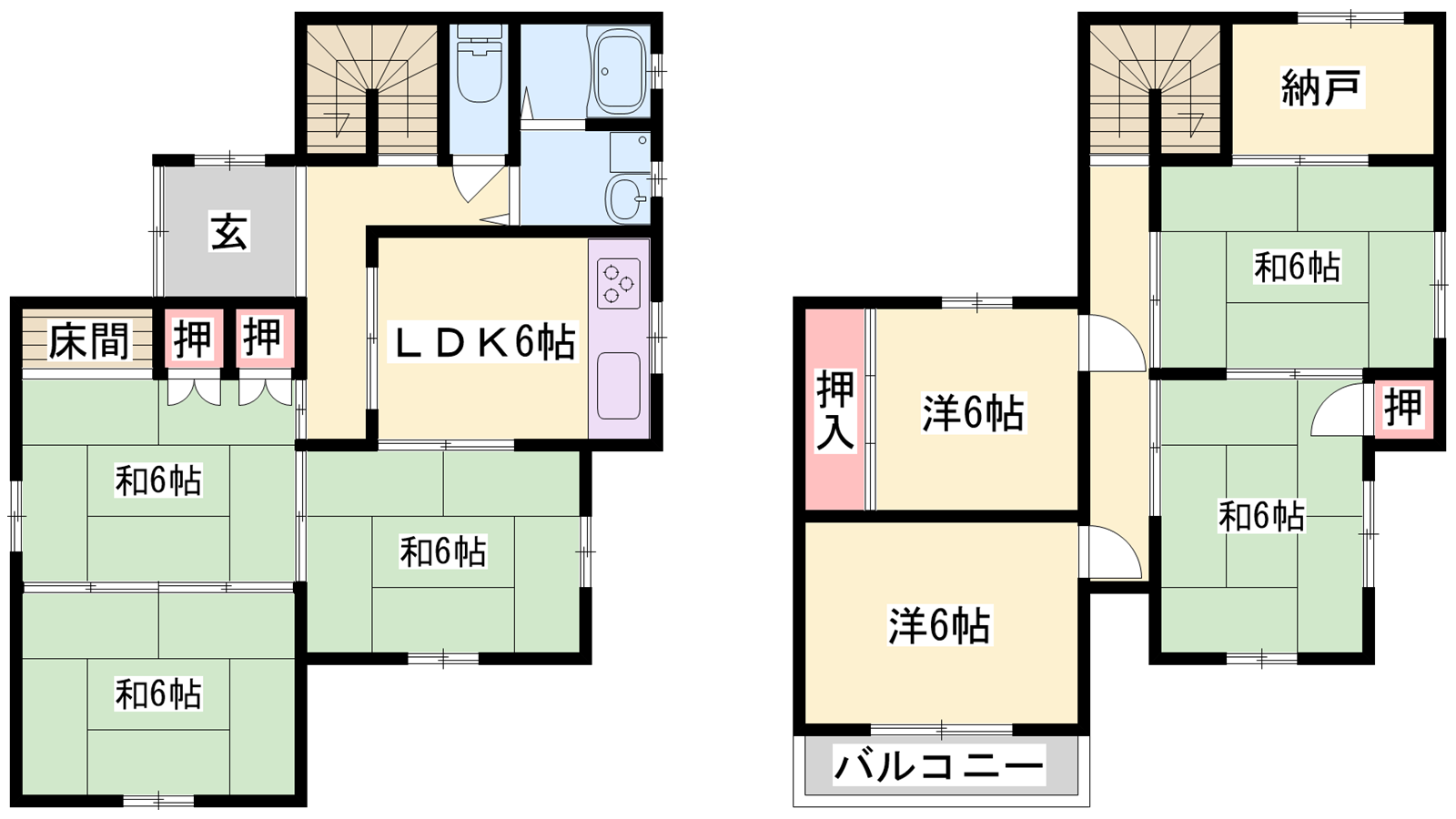 - LDK6帖、洋室6帖、洋室6帖、和室6帖、和室6帖、和室6帖、和室6帖、和室6帖