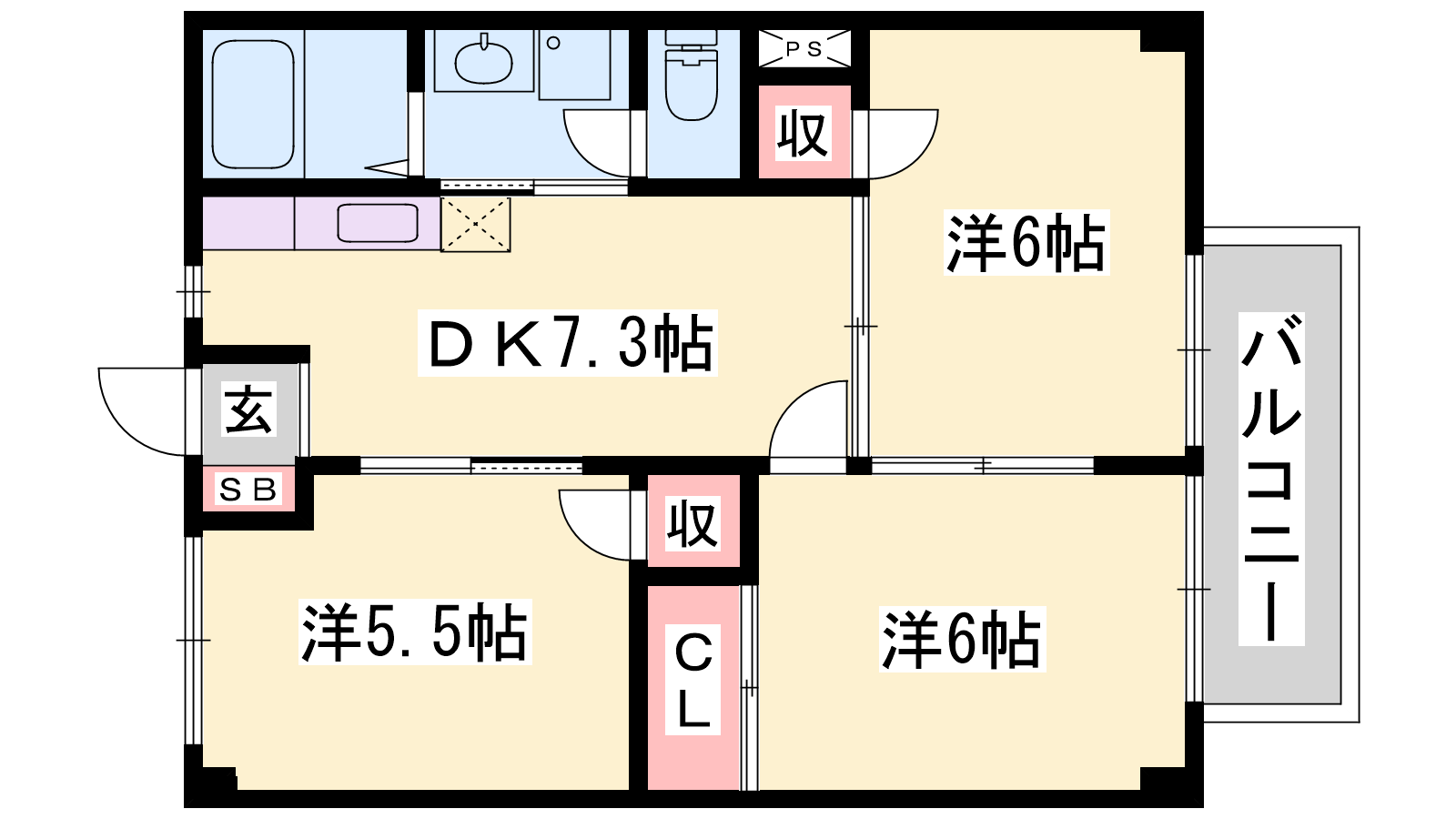 - DK7.3帖、洋室6帖、洋室6帖、洋室5.3帖