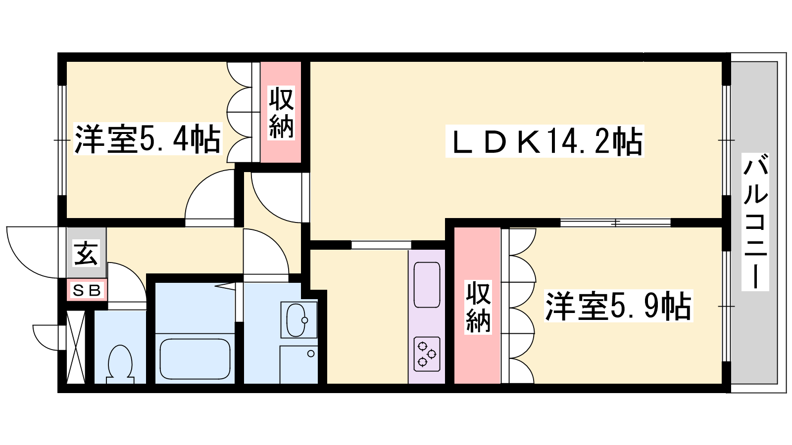 - LDK14.2帖、洋室5.9帖、洋室5.4帖