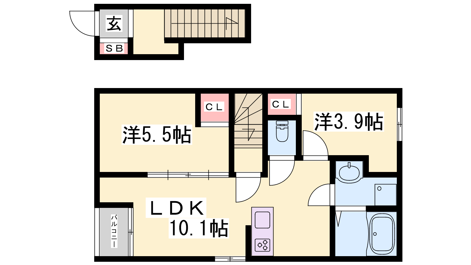 - LDK10.1帖、洋室5.5帖、洋室3.9帖