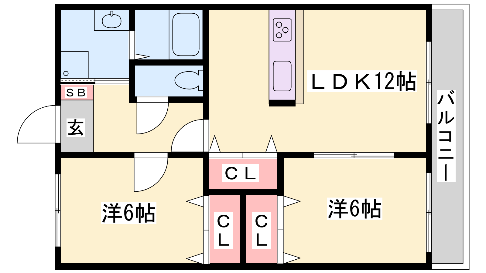 - LDK12帖、洋室6帖、洋室6帖