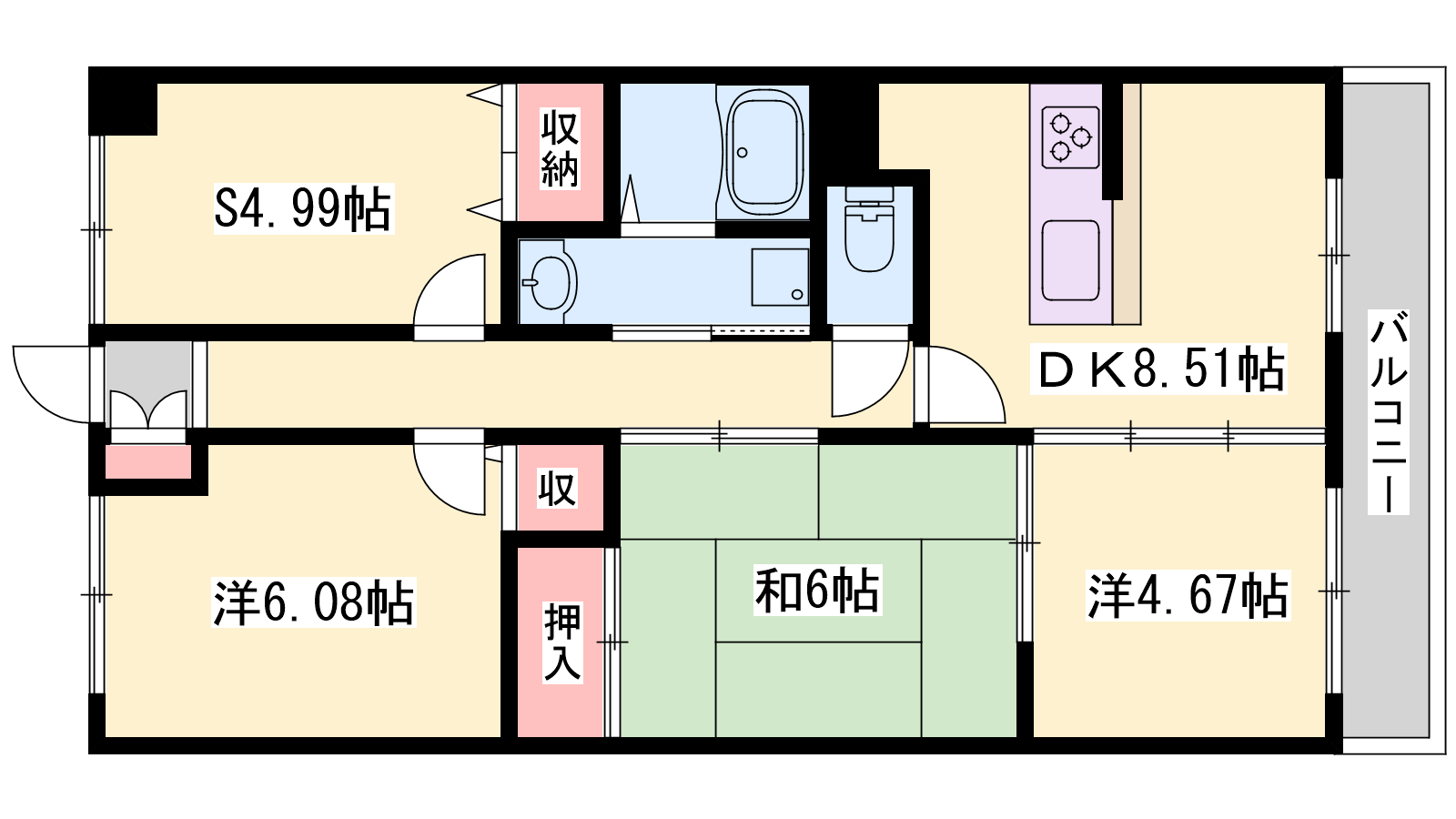 - DK8.51帖、洋室4.67帖、和室6帖、洋室6.08帖、S4.99帖