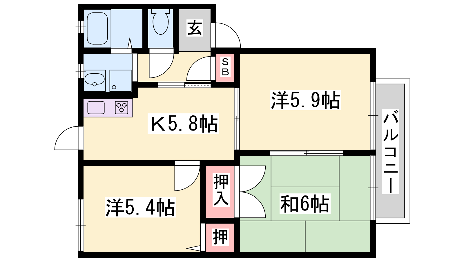 - K5.8帖、洋室5.9帖、和室5.9帖、洋室5.4帖