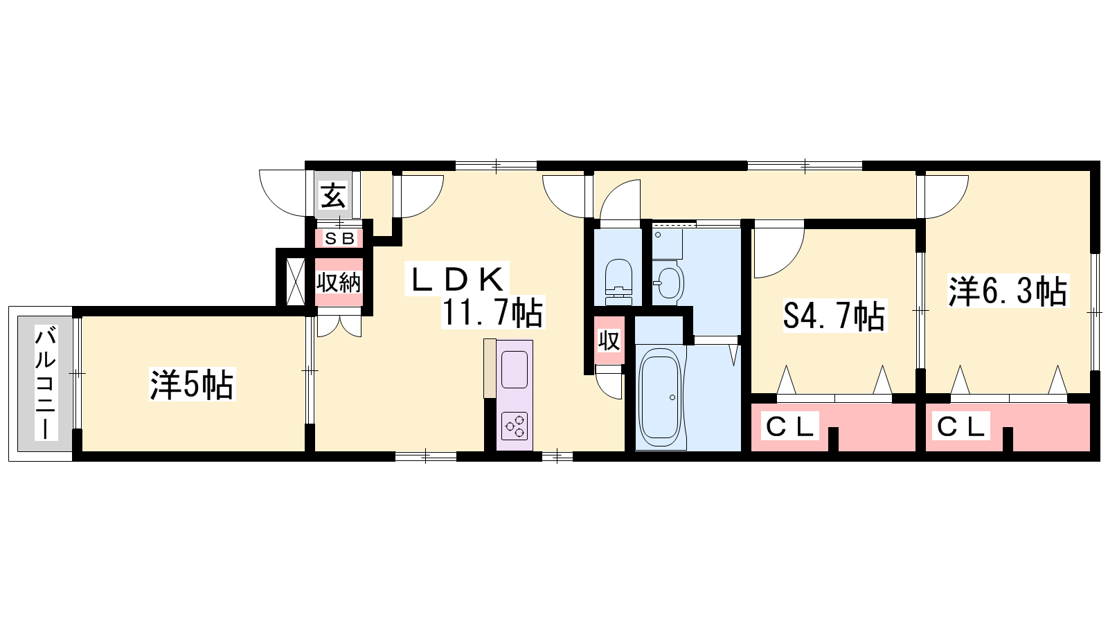 - LDK11.7帖、洋室6.3帖、洋室5帖、S4.7帖