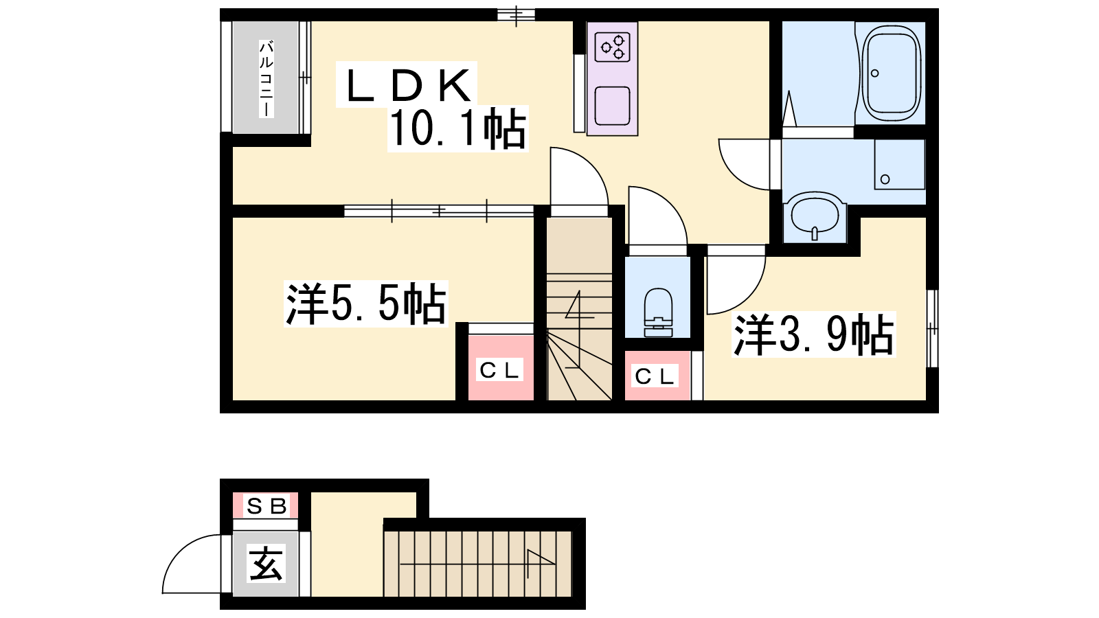 - LDK10.1帖、洋室5.5帖、洋室3.9帖