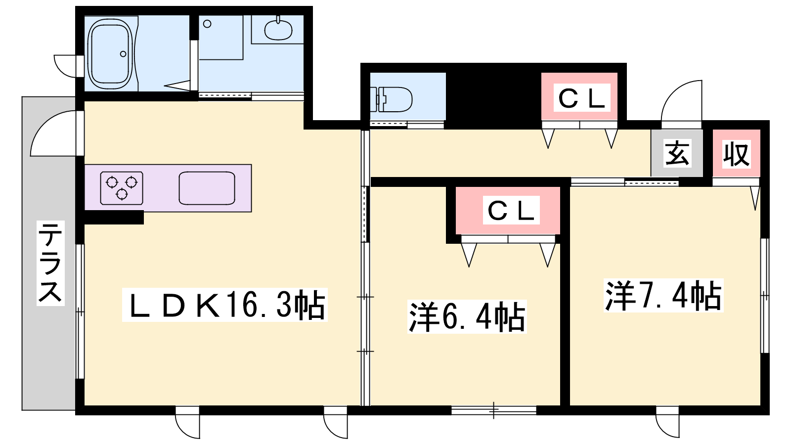 - LDK16.3帖、洋室7.4帖、洋室6.4帖