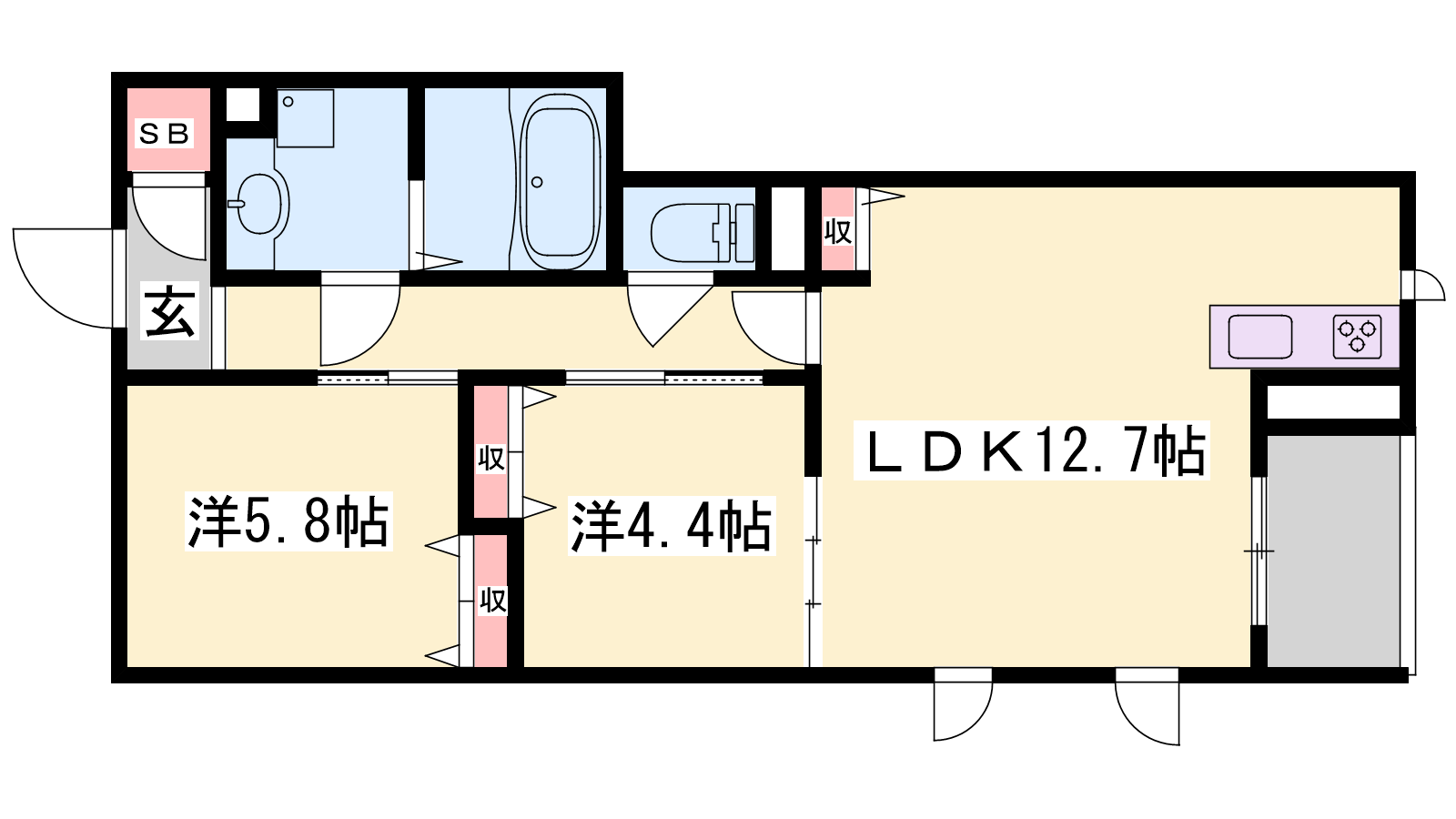 - LDK12.7帖、洋室5.8帖、洋室4.4帖