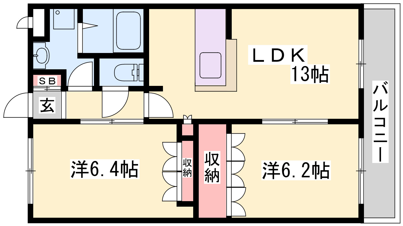 - LDK13帖、洋室6.4帖、洋室6.2帖
