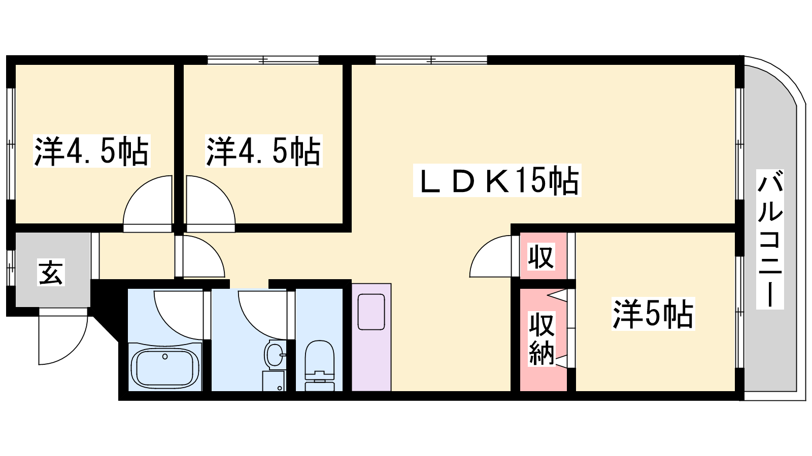 - LDK15帖、洋室5帖、洋室4.5帖、洋室4.5帖