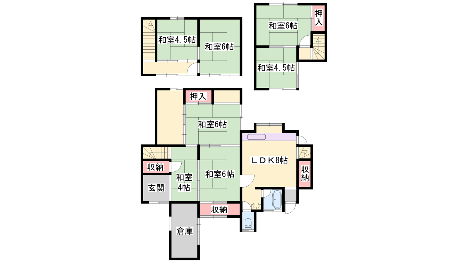 - LDK8帖、和室6帖、和室6帖、和室6帖、和室6帖、和室4.5帖、和室4.5帖、和室4帖