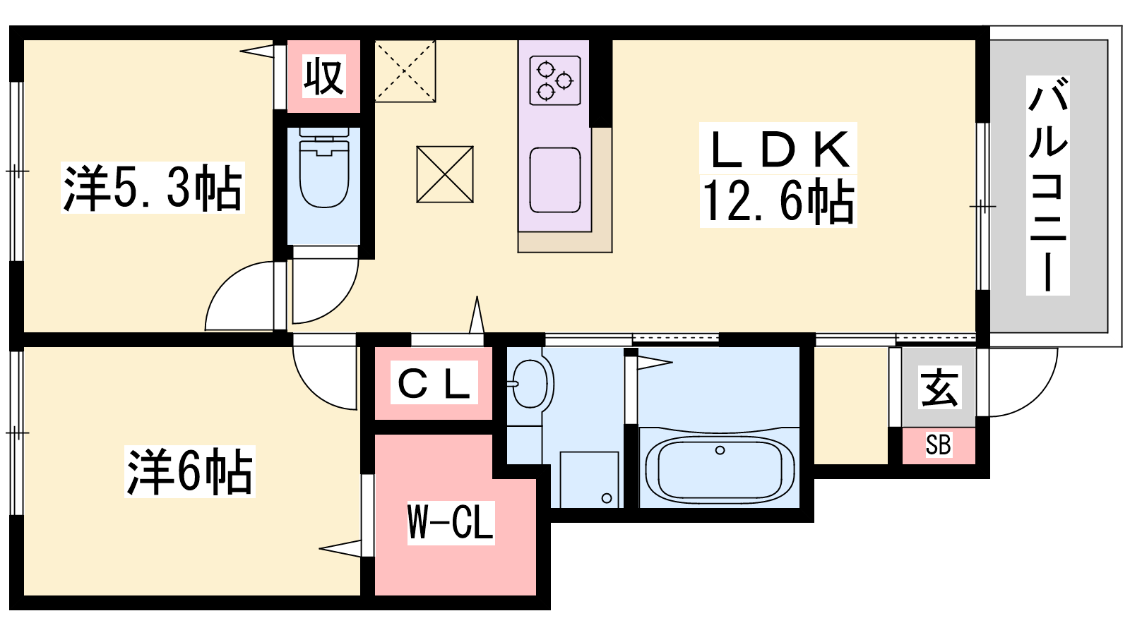- LDK12.6帖、洋室6帖、洋室5.3帖