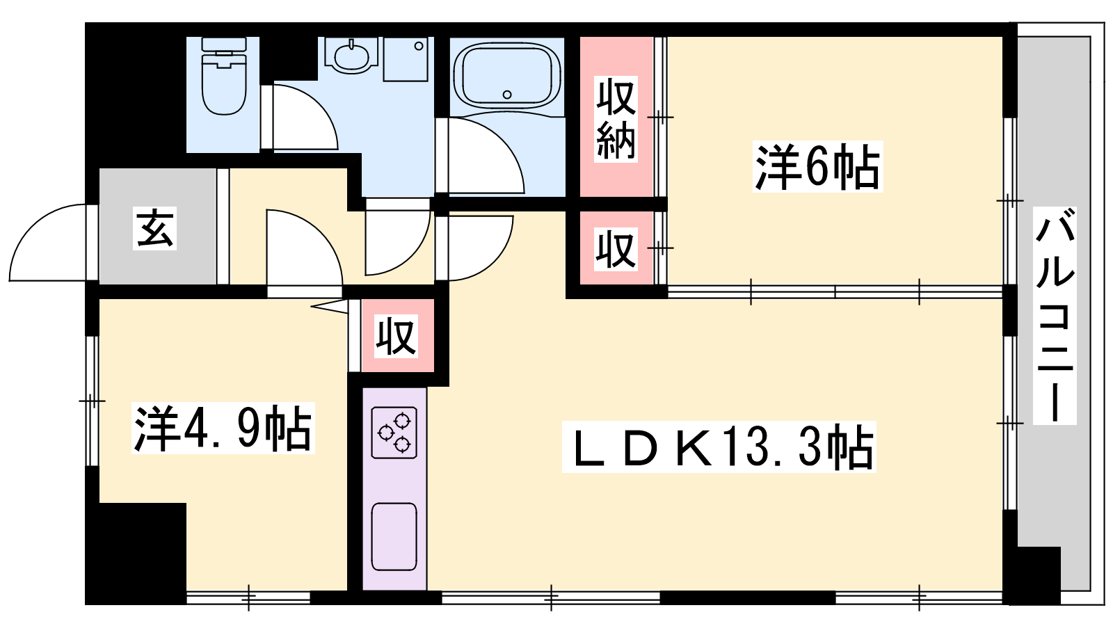- LDK13.3帖、洋室6帖、洋室4.9帖