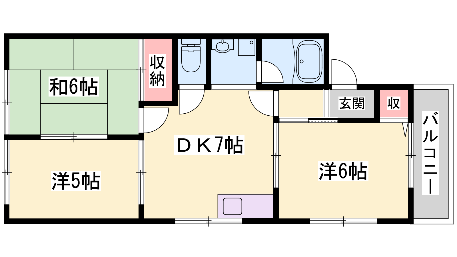 - DK7帖、洋室6帖、洋室5帖、和室6帖