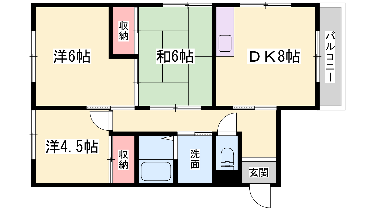 - DK8帖、洋室6帖、洋室4.5帖、和室6帖