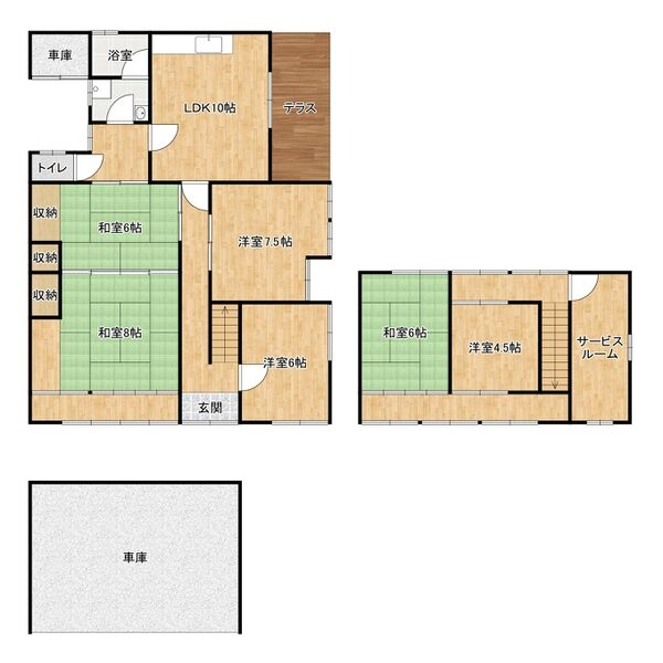 - LDK10帖、洋室7.5帖、洋室6帖、洋室4.5帖、和室8帖、和室6帖、和室6帖