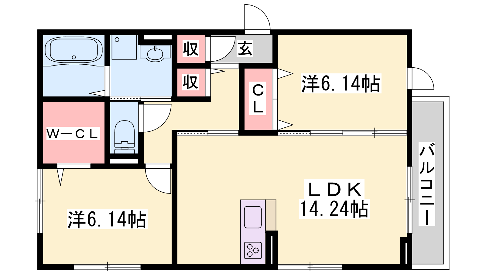 - LDK14.24帖、洋室6.14帖、洋室6.14帖