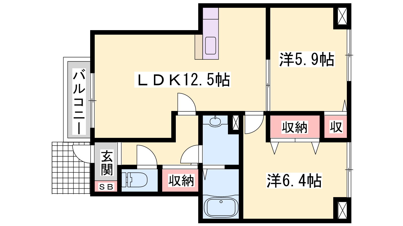 - LDK12.5帖、洋室6.4帖、洋室5.9帖