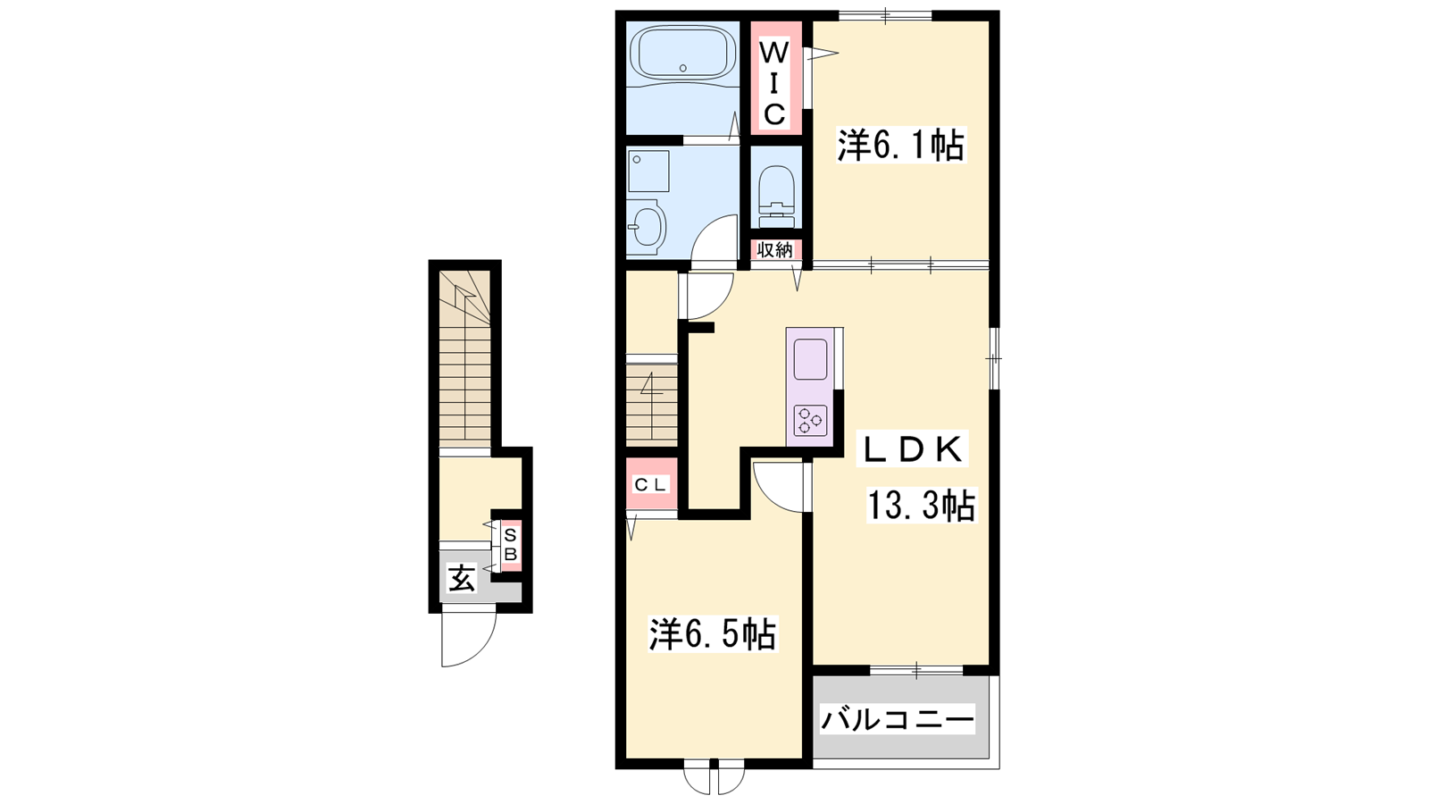 - LDK13.3帖、洋室6.5帖、洋室6.1帖