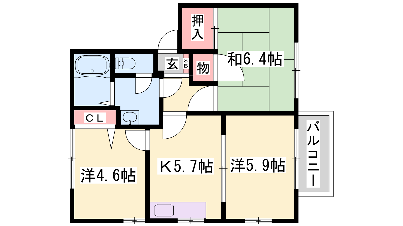 - K5.7帖、和室6.4帖、洋室4.6帖、洋室5.9帖